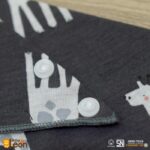 • Cotton Combat: Jenis bahan katun yang memiliki kepadatan tenun tinggi, membuatnya sangat kuat, lembut, dan memiliki daya serap yang sangat baik terhadap cairan seperti air liur atau tumpahan makanan.