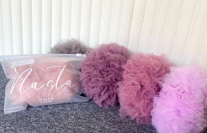 - Soft tulle: Kain tipis, ringan, dan bertekstur halus yang sering digunakan untuk aksesoris hijab karena sifatnya yang tidak panas.
