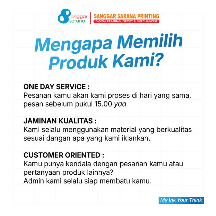- One Day Service: Layanan pencetakan ekspres dimana pesanan akan diproses dan dikirim pada hari yang sama (dengan catatan order masuk dalam jam kerja).