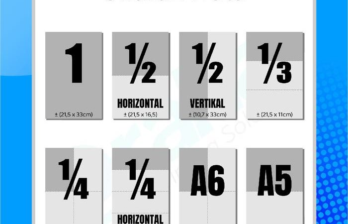 - Folio: Ukuran kertas yang umum digunakan. Ukuran penuh Folio (F4) adalah 21×33 cm. Ukuran lainnya merupakan pecahannya (1/2, 1/3, 1/4).