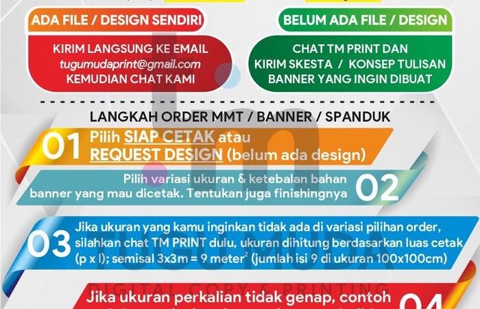 TM Printing melayani cetak spanduk, MMT, banner, dan backdrop dengan desain FULL CUSTOM sesuai keinginan Anda. Tim desain kami siap membantu mewujudkan konsep Anda menjadi karya visual yang menarik. Proses revisi terbuka lebar hingga Anda merasa puas dengan hasilnya, didukung oleh admin yang ramah dan sabar.