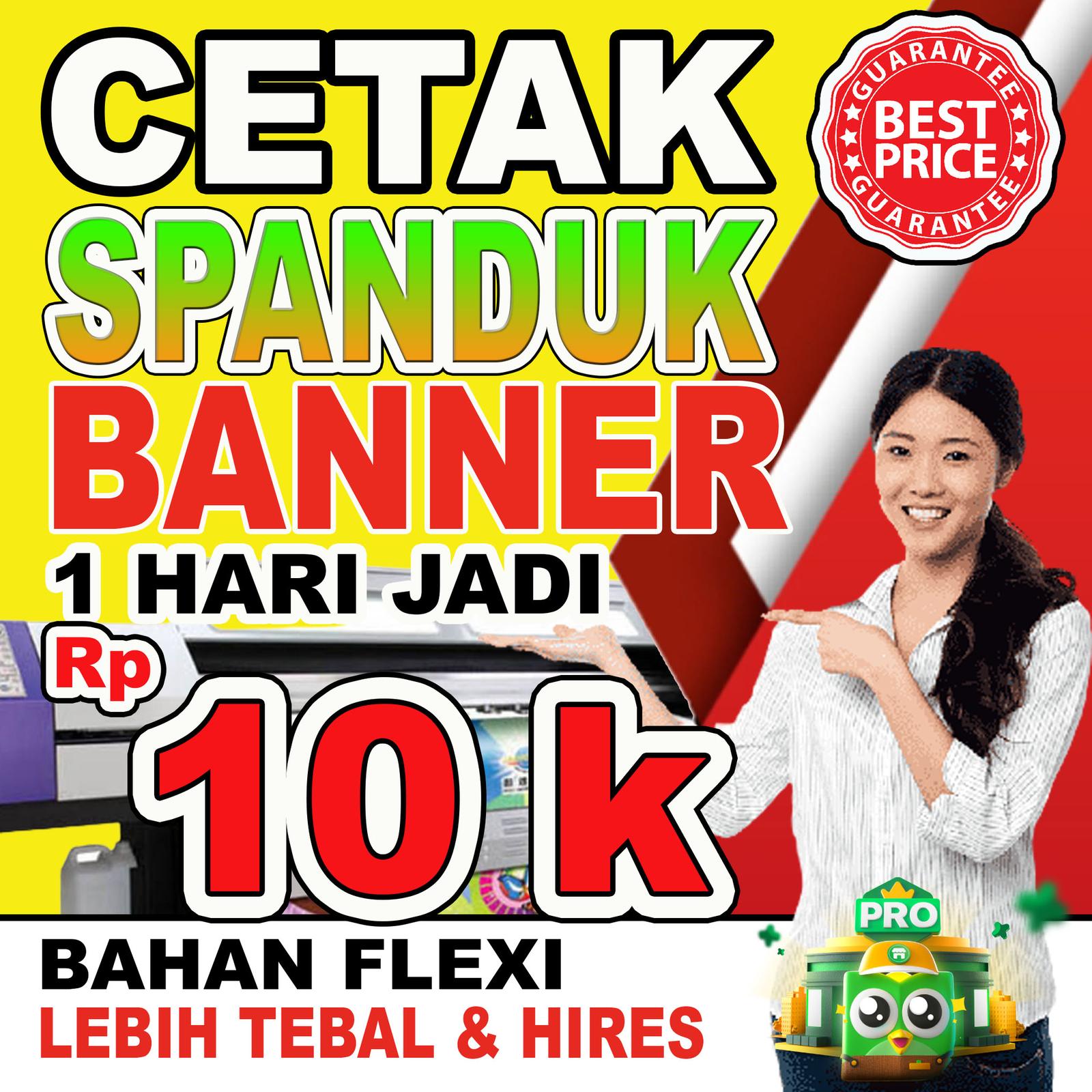 Dapatkan spanduk berkualitas tinggi dengan proses cepat hanya dalam 1 hari. Kami menggunakan bahan Flexi Standar 285gr yang tahan air dan cuaca, menjadikannya solusi sempurna untuk kebutuhan promosi outdoor Anda.