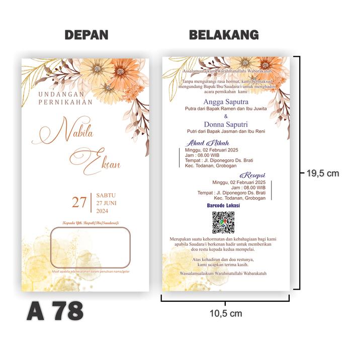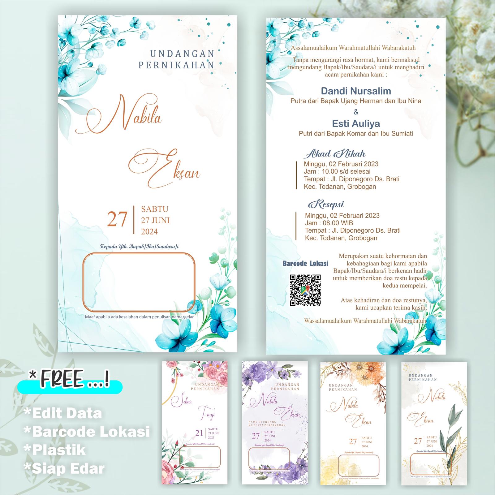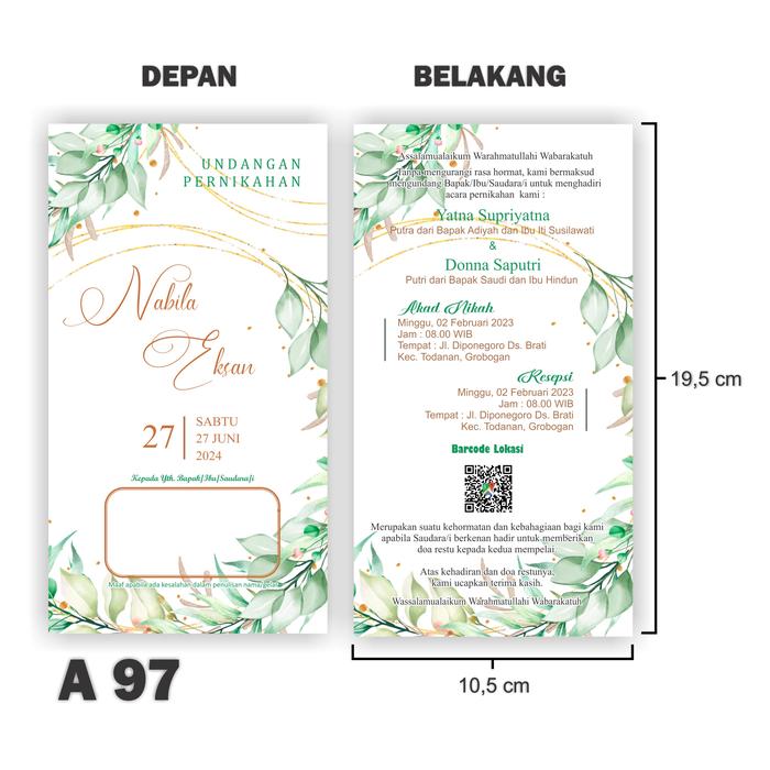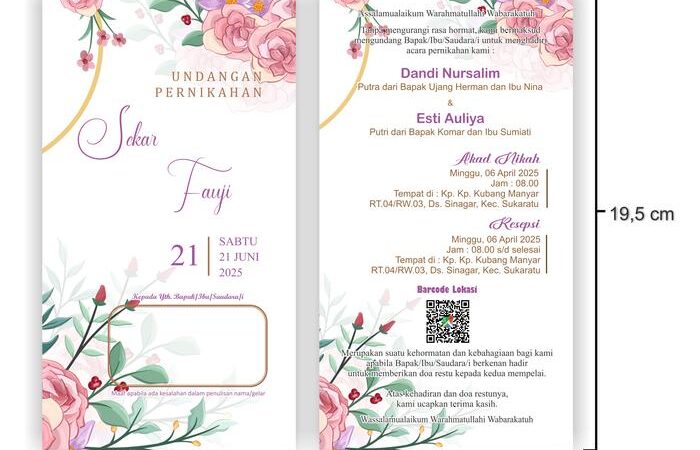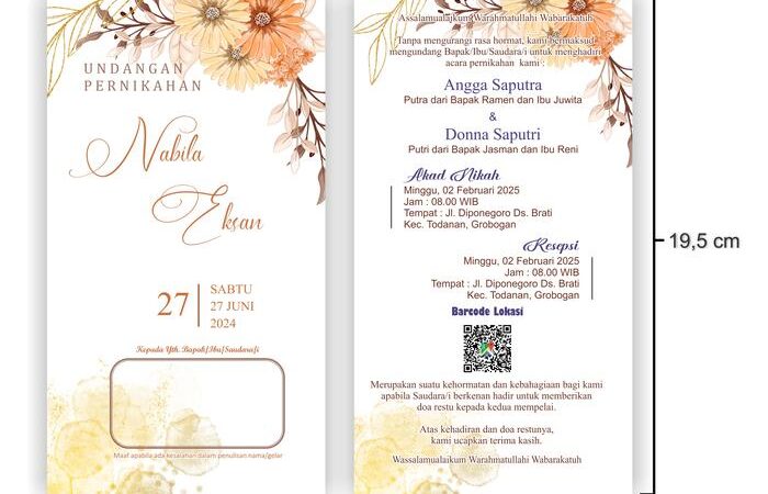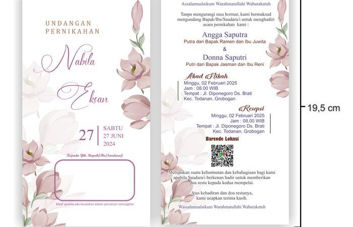 Ukuran undangan adalah 19,5cm x 10,5cm (tanpa lipat) dan setiap pesanan minimum dimulai dari 100 lembar. Setiap undangan akan dilindungi dengan plastik OPP transparan secara gratis untuk menjaga kualitasnya selama pengiriman. Proses pemesanan mudah melalui TikTok Shop. Kami menyediakan kebebasan revisi tanpa batas untuk kesalahan data hingga Anda merasa puas.