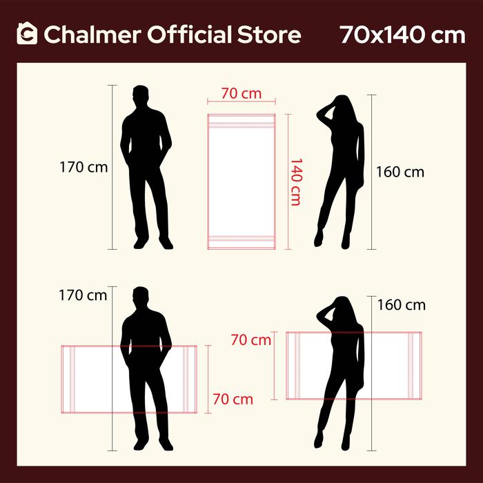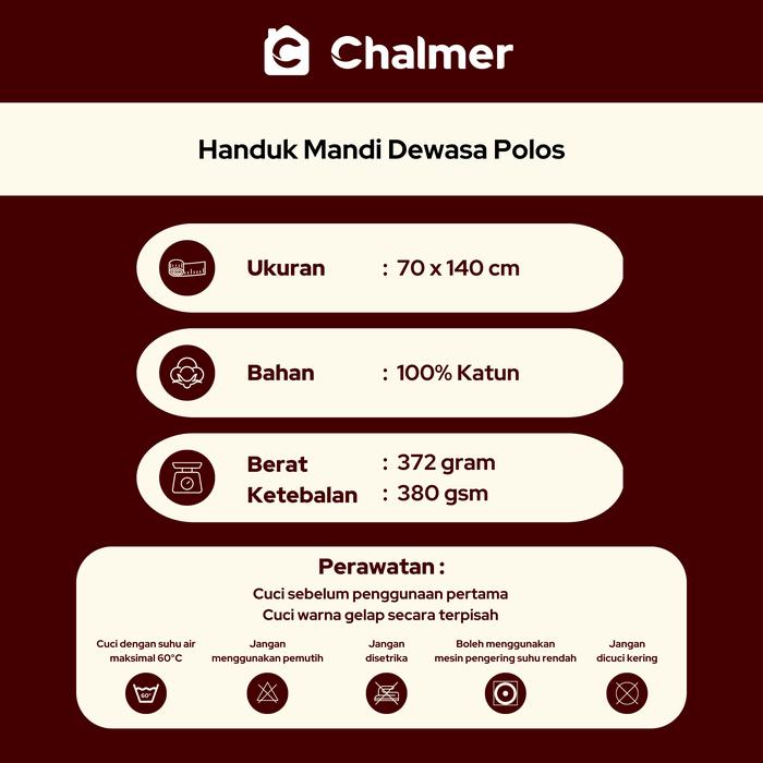 Rasakan sensasi mewah setiap kali selesai mandi dengan Handuk Chalmer Dewasa. Dirancang khusus dengan ukuran besar 70×140 cm, handuk ini memberikan cakupan yang sempurna untuk mengeringkan tubuh dengan cepat dan nyaman. Dibuat dari bahan kain terry 100% katun berkualitas, handuk ini memiliki daya serap air yang sangat tinggi, menjadikan rutinitas mandi Anda lebih menyenangkan.