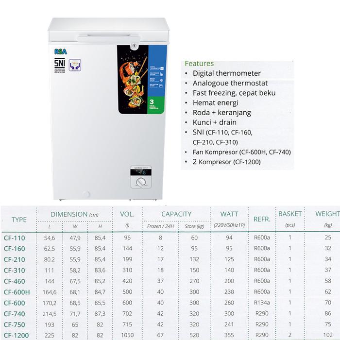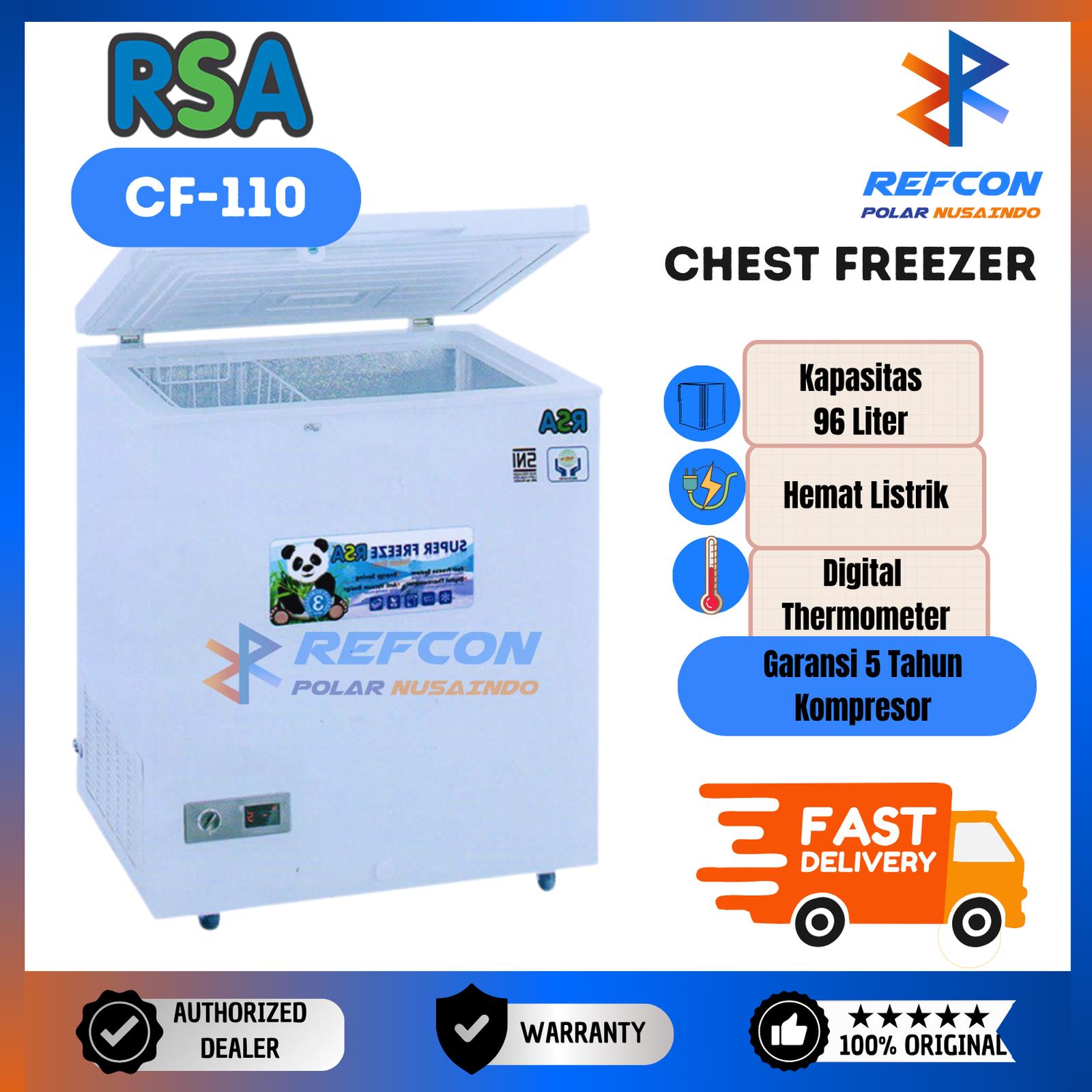 Jaga kesegaran dan kualitas bahan makanan beku Anda dengan Chest Freezer RSA CF-110. Dengan kapasitas 96 liter, freezer box ini merupakan investasi tepat untuk rumah tangga, UKM kuliner, atau bisnis rumahan. Dilengkapi dengan teknologi Fast Freezing, produk ini cepat membekukan dan sangat hemat energi.