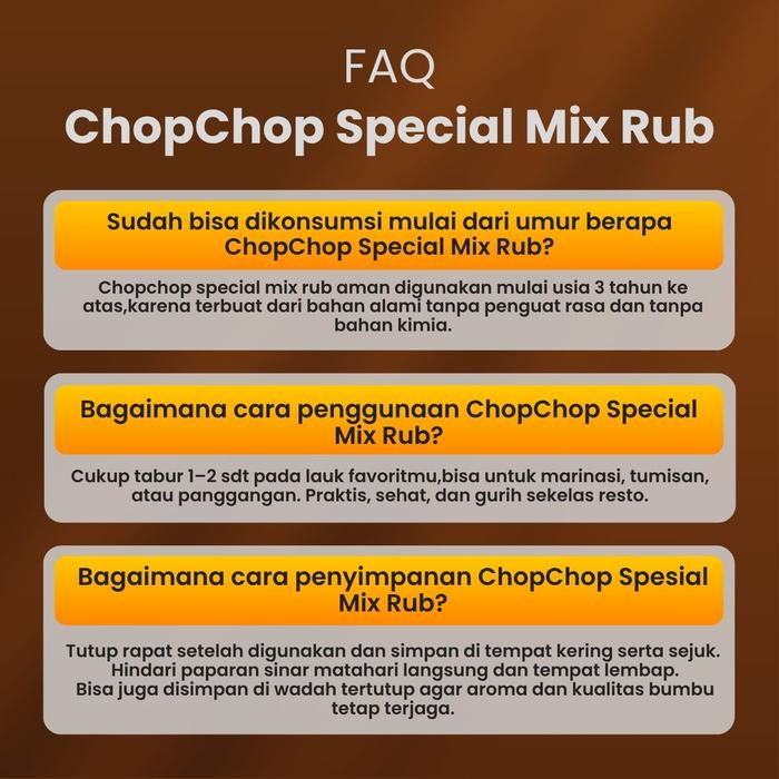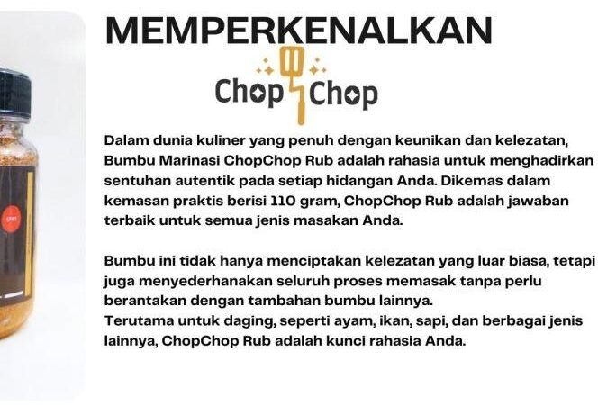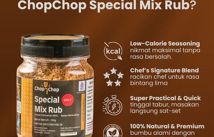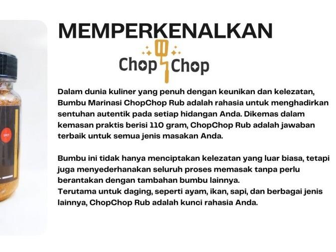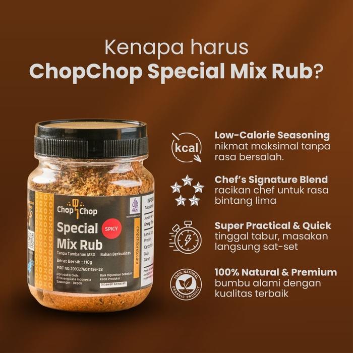 Hadirkan keajaiban rasa di setiap masakan dengan Chop Chop Special Mix Rub Spicy. Bumbu marinasi serbaguna ini dirancang khusus untuk Anda yang menginginkan hidangan lezat, praktis, dan lebih sehat. Dengan komposisi rendah kalori, bumbu ini cocok untuk segala jenis protein seperti ayam, daging sapi, ikan, tahu, dan tempe. Racikan rempah-rempah pilihan memberikan cita rasa khas yang menggugah selera, cocok untuk metode memasak apa pun: panggang, bakar, tumis, atau goreng.
