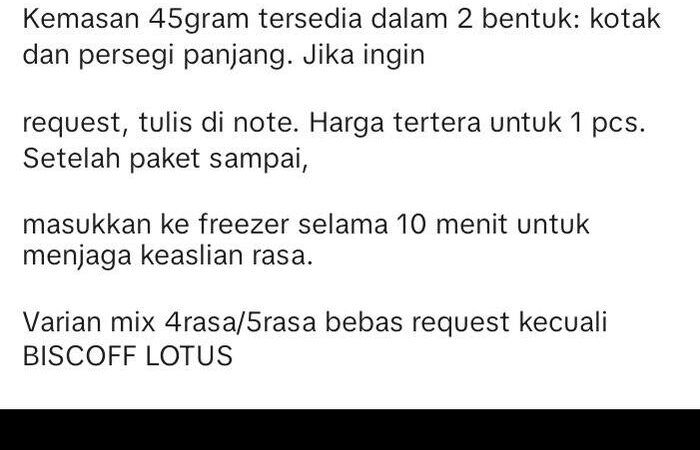 | Persegi Panjang | Rp 25.000 | Varian mix 4 atau 5 rasa dapat dipilih bebas, kecuali Biscoff Lotus. |