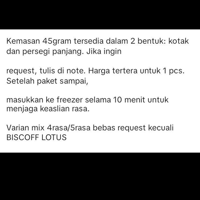 | Persegi Panjang | Rp 25.000 | Varian mix 4 atau 5 rasa dapat dipilih bebas, kecuali Biscoff Lotus. |