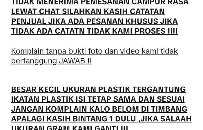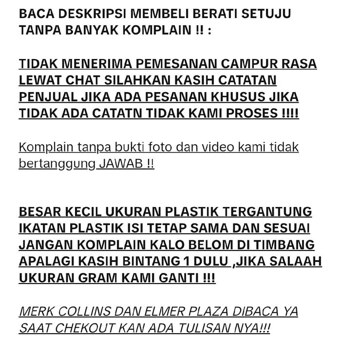 - Isi bersih sesuai ukuran yang dipilih. Jika setelah ditimbang ada selisih gramasi, kami garansi ganti. Jangan langsung beri bintang 1.