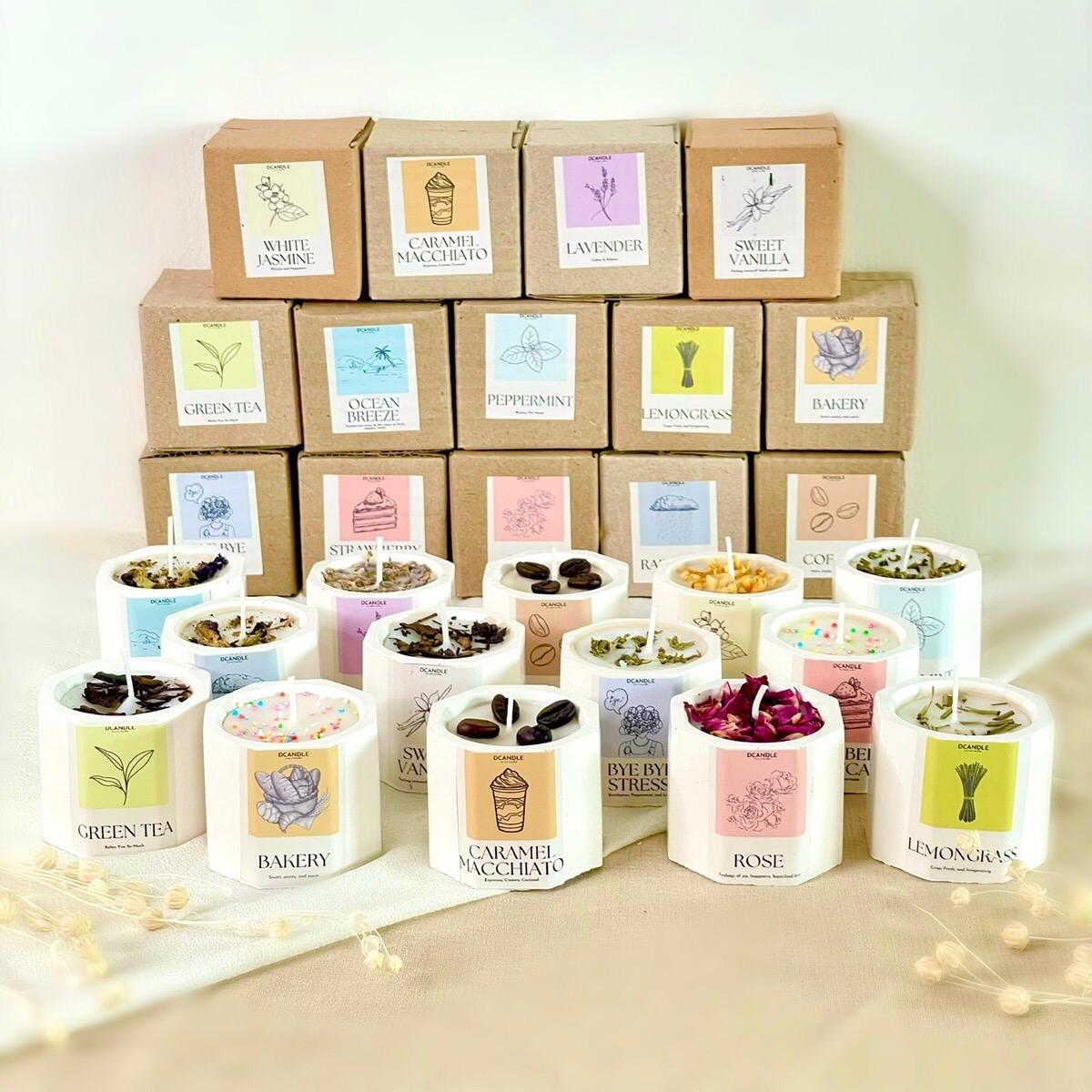 Sweet Vanilla, Caramel Macchiato, Lemongrass, Green Tea, Bye Bye Stress, Lavender, White Jasmine, Bakery, Strawberry Shortcake, Rose, Peppermint, Coffee, Ocean Breeze, Rainy Day, Purple Grape, Watermelon Sugar, Lily of The Valley, Honey Bee, Chamomile.