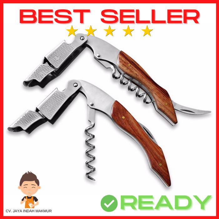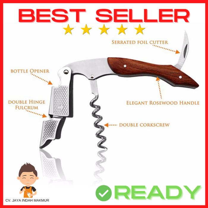Alat ini menggabungkan tiga fungsi utama dalam satu perangkat: serrated foil cutter untuk membuka lapisan pelindung mulut botol, double corkscrew yang tajam dan efisien, serta bottle opener yang praktis. Dengan mekanisme double-hinged fulcrum, Anda dapat mencabut sumbat botol dengan lebih mudah dan cepat, tanpa usaha berlebihan.