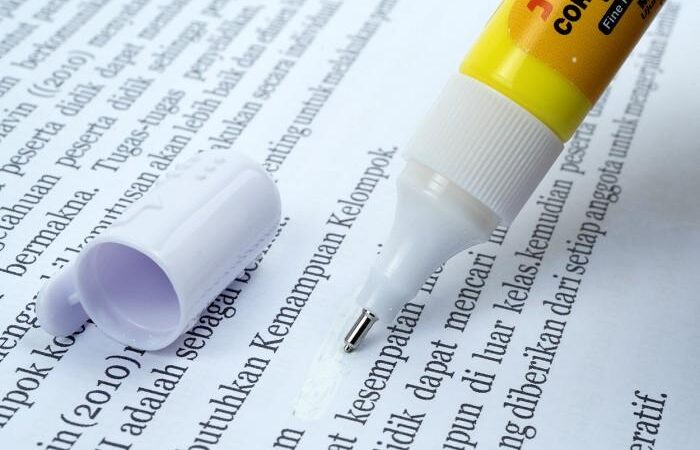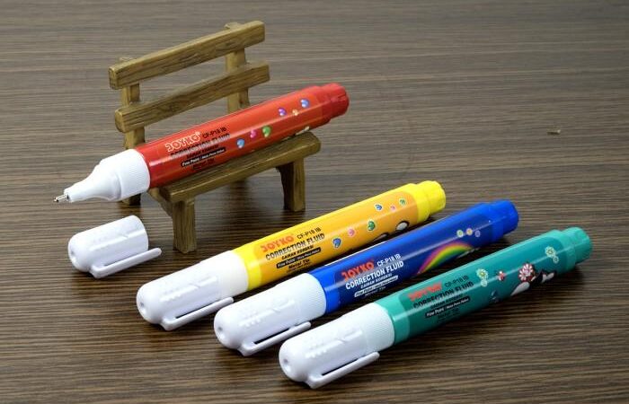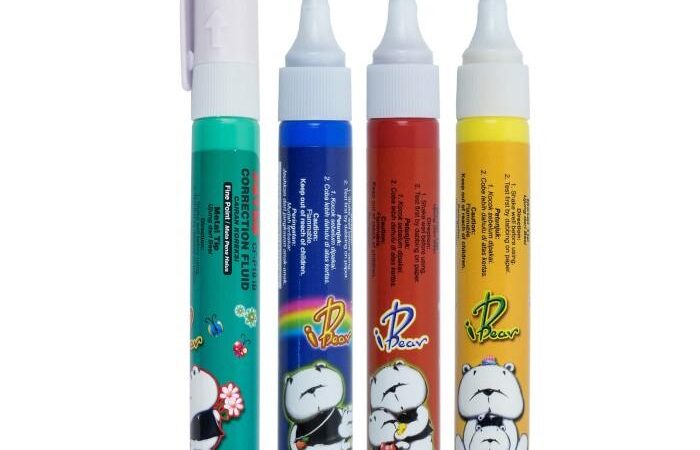 - Correction Fluid: Disebut juga cairan koreksi atau tip-ex. Merupakan cairan putih khusus yang digunakan untuk menutupi kesalahan tulisan di atas kertas. Diaplikasikan dengan kuas atau aplikator logam, kemudian dapat ditulis di atasnya setelah kering.