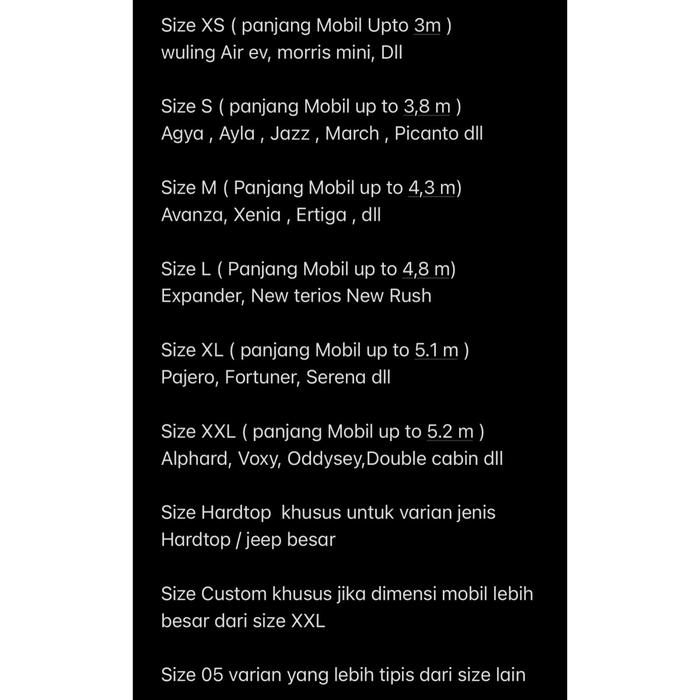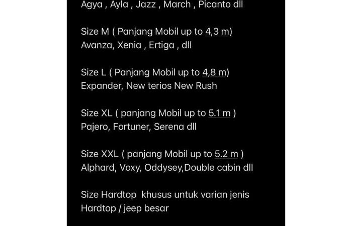| Ukuran | Panjang Mobil | Contoh Model Mobil |