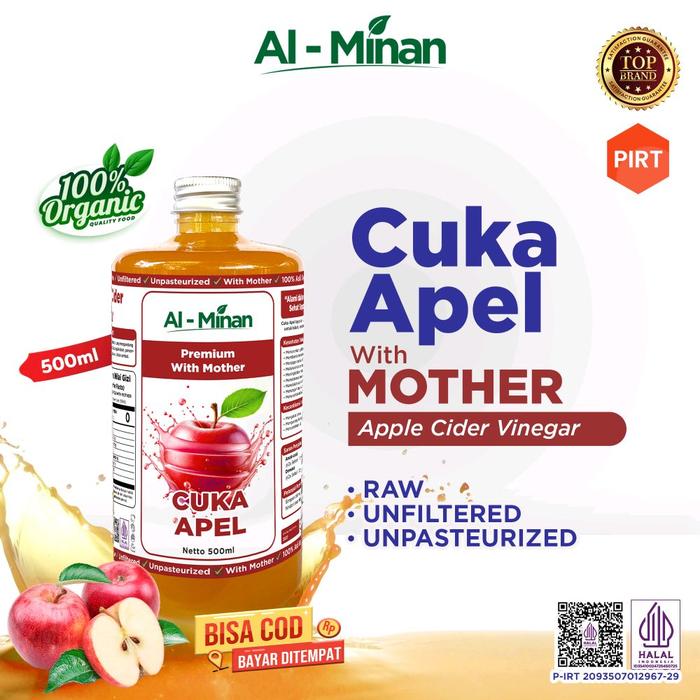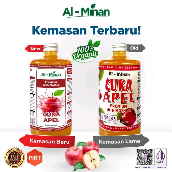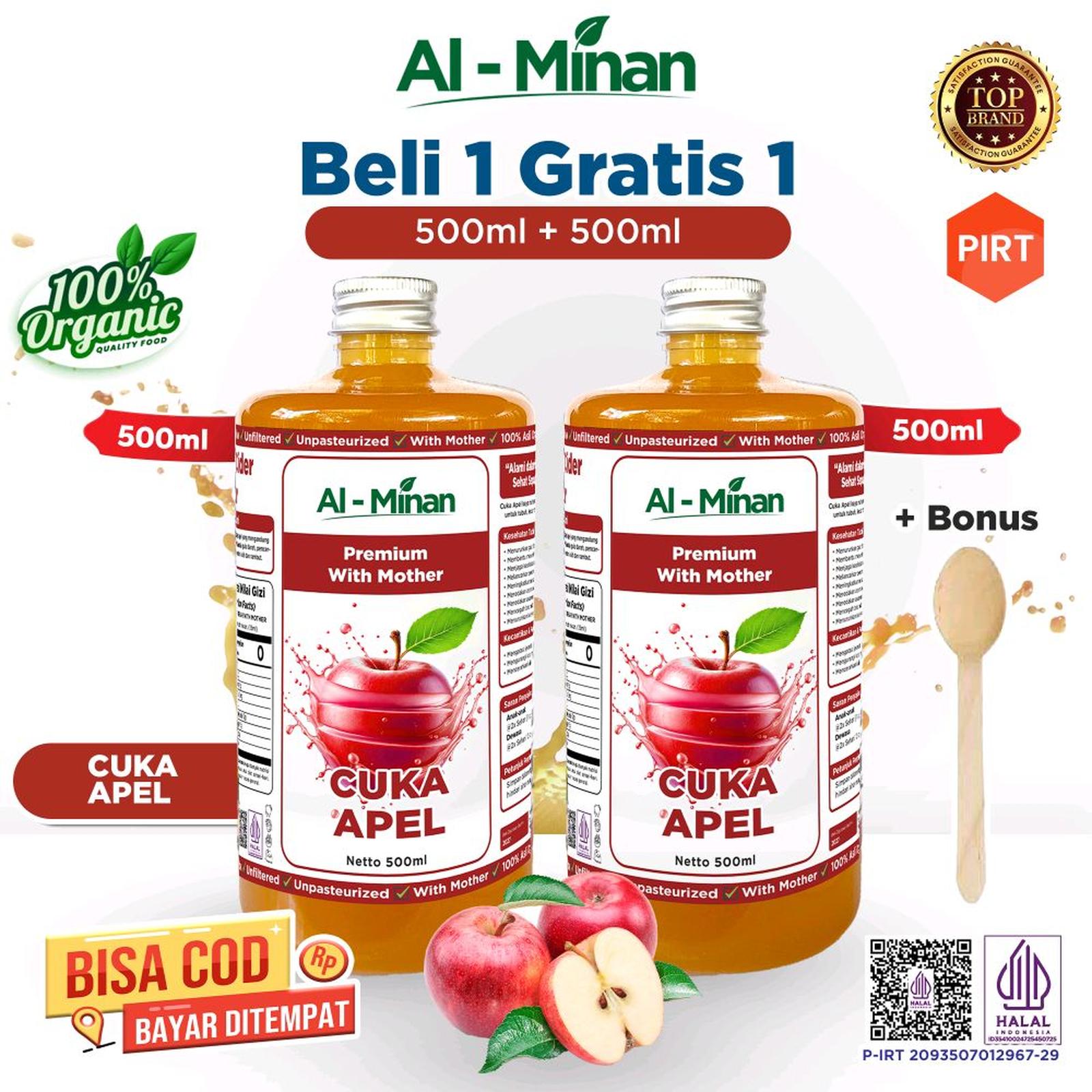 Rasakan kualitas premium Cuka Apel Al Minan yang 100% organik, telah tersertifikasi Halal dan PIRT. Dapatkan penawaran spesial Beli 1 Botol Gratis 1 Botol (@500ml) dengan harga grosir langsung dari produsen. Sangat cocok untuk program diet, detoks, dan kesehatan sehari-hari.