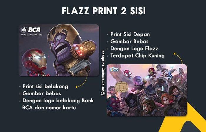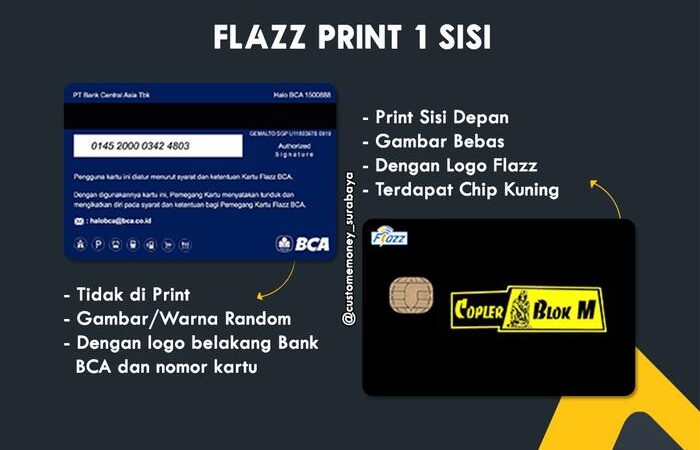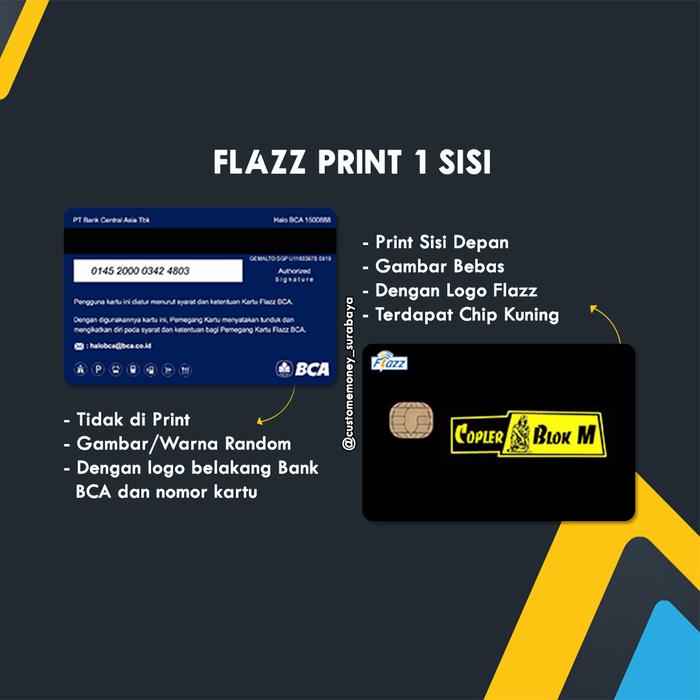 Cetak kartu Flazz / E-Toll BCA Gen 2 versi terbaru sesuai keinginan Anda! Kini top up lebih mudah dan praktis langsung melalui ponsel yang mendukung fitur NFC. Tersedia pilihan cetak 1 sisi (depan saja) atau 2 sisi (depan dan belakang).