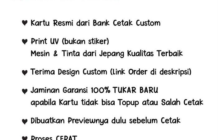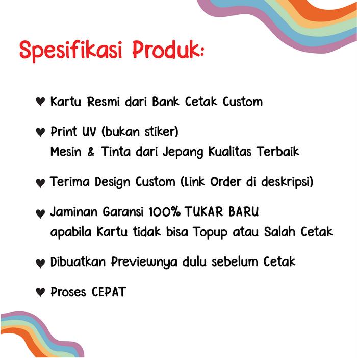 Dapatkan kartu e-Money custom dengan desain sesuai keinginan Anda! Cetak foto, gambar idola, logo klub, atau desain unik lainnya pada kartu Flazz BCA Gen 2, Mandiri e-Money, BNI TapCash, atau BRI Brizzi yang resmi dari bank.