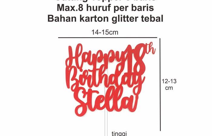 Ciptakan momen istimewa sempurna dengan dekorasi kue yang personal! Custom Cake Topper kami terbuat dari karton premium tebal 300 gsm yang kokoh, bukan akrilik tipis, sehingga tulisan tampil lebih elegan dan tidak mudah patah. Setiap pesanan sudah termasuk tongkat transparan standar yang aman untuk ditancapkan langsung ke dalam kue. Anda bebas memilih jumlah baris teks sesuai kebutuhan dan kami akan menyesuaikan font secara gratis. Untuk tulisan dan font spesifik, silakan tulis di nota pesanan atau chat kami langsung. Pengiriman cepat, siap membuat perayaan ulang tahun Anda semakin berkesan!
