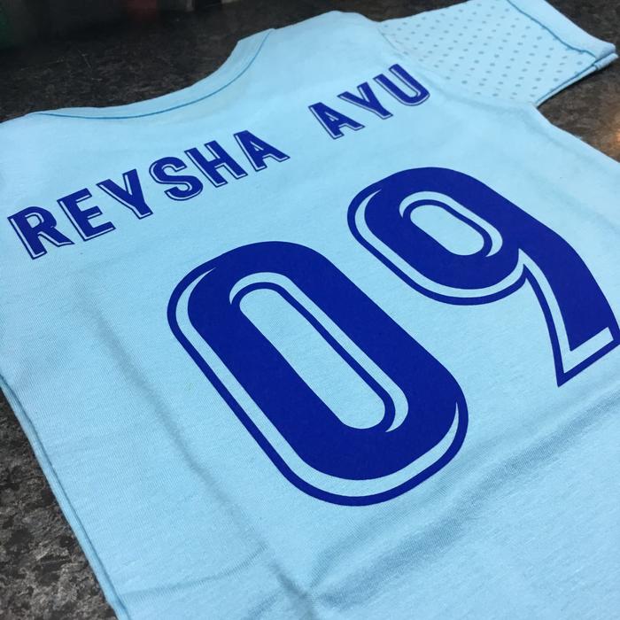 Personalitas setiap bintang lapangan kecil Anda dengan layanan custom nama dan nomor punggung untuk semua jenis jersey bayi. Kami menggunakan bahan Polyflex Korea berkualitas tinggi yang tidak mudah rusak meskipun dicuci berulang kali. Nama dan nomor akan dipasang dengan teknik press panas, menjamin hasil yang rapi dan tahan lama.