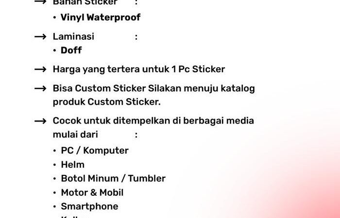 Tersedia juga layanan custom sticker sesuai dengan permintaan Anda. Cocok untuk ditempel pada laptop, helm, tumbler, kaca mobil, motor, handphone, kulkas, dan berbagai media lainnya. Pesan sekarang dan lengkapi koleksi sticker Anda!