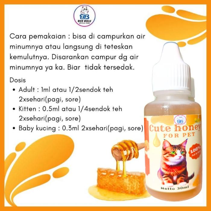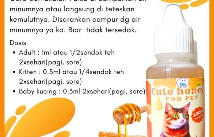 | Mengandung madu alami & vitamin | Bayi Kucing (1 bulan): 0.3 ml, 2x sehari (pagi & sore) |