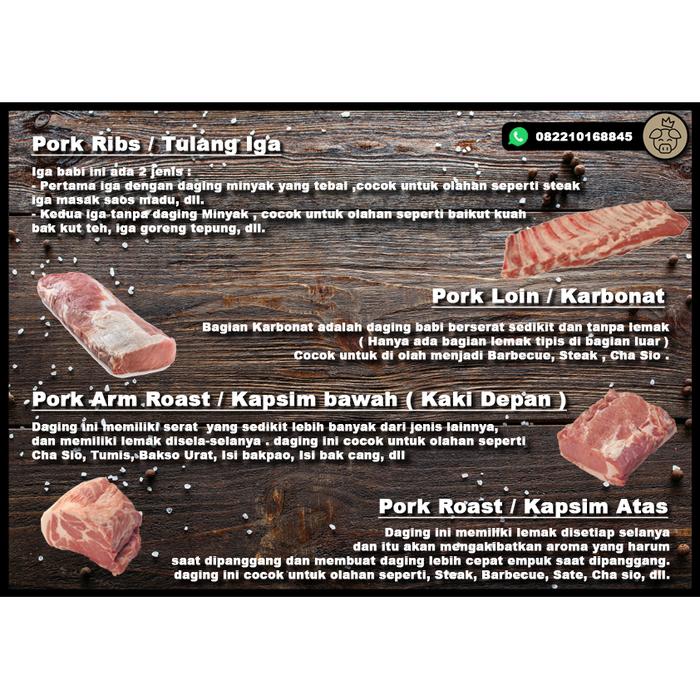- Kapsim: Bagian daging dari punggung babi (dada), memiliki tekstur yang lembut dan kadar lemak yang seimbang, sering disebut juga sebagai collar butt.