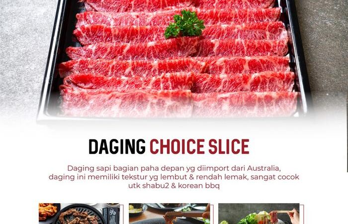 Daging Sapi Beef Slice Choice (Bolar Blade) diimpor langsung dari Australia dengan kualitas premium. Potongan daging ini berasal dari bagian paha depan (bolar blade), memiliki tekstur lembut, serat halus, dan rendah lemak, menjadikannya pilihan ideal untuk berbagai hidangan gourmet.