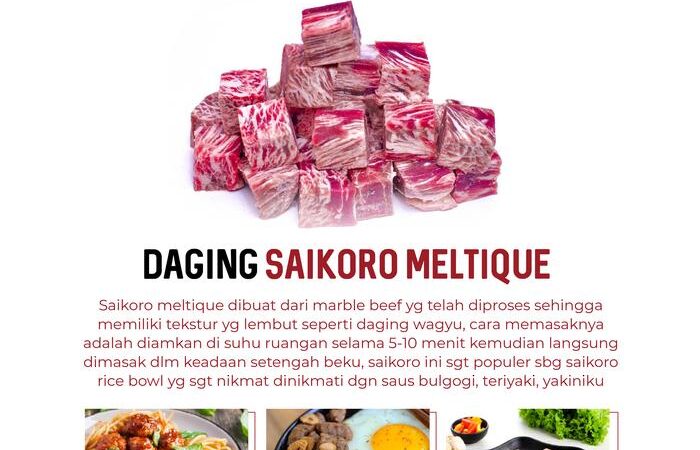 Raih pengalaman kuliner restoran premium langsung di dapur Anda dengan Daging Sapi Meltique Saikoro. Terbuat dari marble beef Australia berkualitas tinggi, setiap potongannya memiliki lemak yang tersamar sempurna (marbling) yang menjamin kelembutan dan cita rasa luar biasa saat dimasak. Teksturnya sangat juicy dan empuk, mirip dengan daging wagyu, membuatnya menjadi pilihan utama untuk hidangan istimewa.