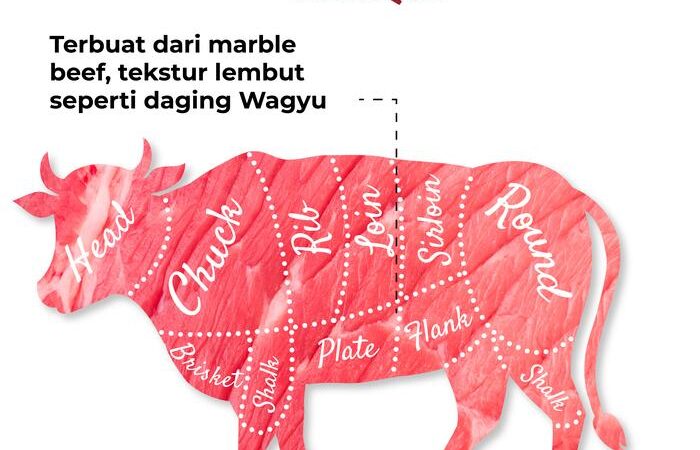 Marble Beef: Daging sapi yang memiliki pola lemak yang tersamar di antara serat dagingnya (marbling). Pola ini membuat daging menjadi sangat lembut, juicy, dan penuh rasa ketika dimasak.