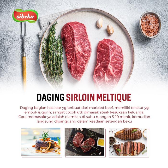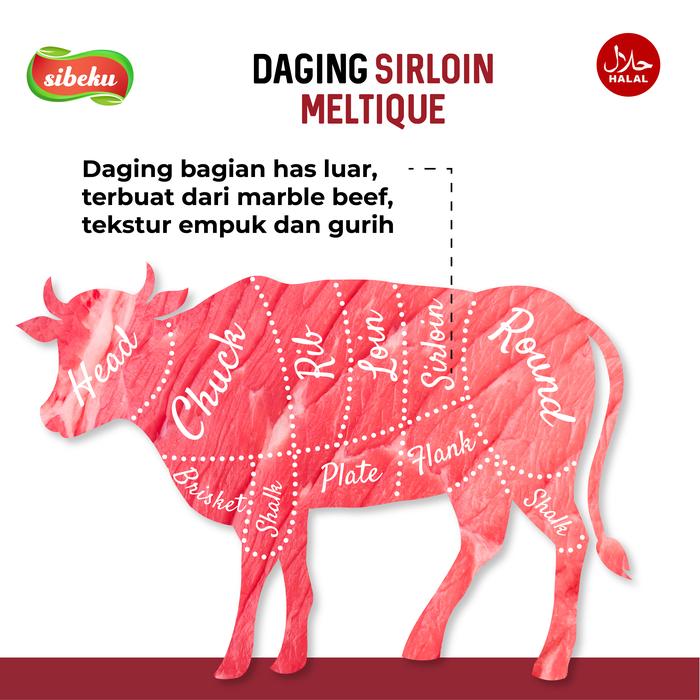 Hadirkan sajian steak restoran berkualitas tinggi di meja makan keluarga Anda dengan Daging Sapi Meltique Sirloin Halal dari Sibeku. Dipilih dari bagian has luar (sirloin) terbaik yang diimpor langsung dari Australia, setiap potongan diproses dengan teknik khusus penyuntikan lemak nabati untuk menciptakan marbling sempurna. Hasilnya adalah daging yang luar biasa empuk, juicy, dan penuh cita rasa gurih alami, meleleh di mulut seperti steak premium.
