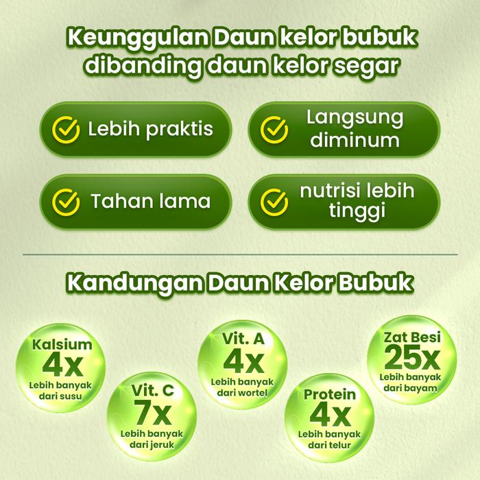 | Bubuk Daun Kelor Moringa | Sumber antioksidan, vitamin A, C, zat besi, dan kalsium. Membantu meningkatkan stamina dan metabolisme tubuh. | Campurkan 1 sendok makan bubuk daun kelor ke dalam air hangat, jus, atau smoothie. |