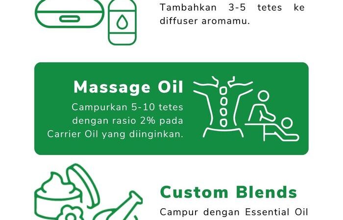 - Topikal: Encerkan dengan carrier oil sebelum dioleskan ke kulit untuk pijat atau relaksasi.