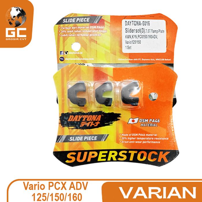 Optimalkan performa CVT motor matic Anda dengan Daytona Slide Piece SuperStok 5016. Komponen krusial ini dirancang khusus untuk model Honda Vario 125/150, PCX 125/150/160, ADV 150/160, serta berbagai model lainnya.