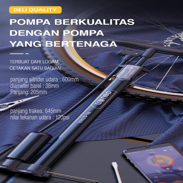 Jaga tekanan ban kendaraan Anda selalu optimal dengan Deli Air Pump manual. Dirancang untuk berbagai keperluan, pompa ini cocok untuk sepeda, sepeda motor, mobil, bola, serta peralatan olahraga dan rumah tangga lainnya yang memerlukan pengisian udara.