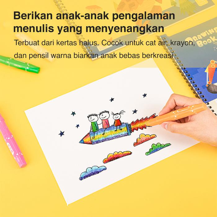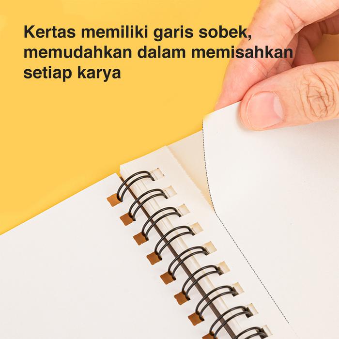 Keunggulan produk ini terletak pada kualitas kertasnya yang premium. Dengan ketebalan 100 gsm, kertasnya sangat kuat, tidak mudah tembus saat menggunakan spidol atau cat air, dan tidak mudah sobek saat dihapus berulang kali. Permukaannya yang halus memudahkan setiap goresan pensil dan pewarnaan, menghasilkan gambar yang rapi dan maksimal. Binding spiral memastikan buku dapat dibuka rata sepenuhnya, memudahkan proses menggambar hingga ke pinggiran kertas dan membuatnya sangat nyaman digunakan.