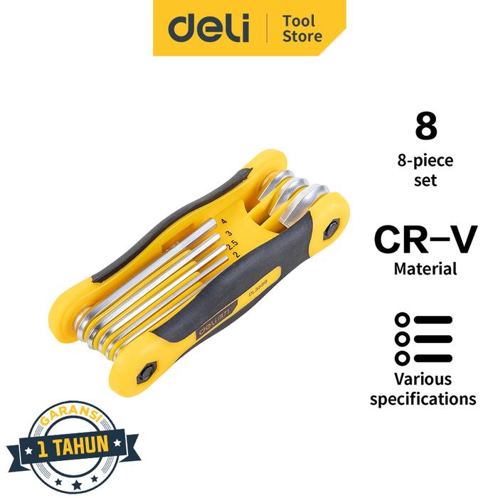 | Fitur Utama | – Terbuat dari material Chrome Vanadium berkualitas tinggi untuk kekuatan dan ketahanan maksimal. – Permukaan berlapis nikel, tahan karat dan awet. – Penandaan ukuran menggunakan teknologi laser-marking, jelas dan tidak mudah luntur. – Desain lipat dan dapat diputar, sangat praktis untuk disimpan dalam kotak工具 atau dibawa ke mana saja. – Cocok untuk melepaskan dan mengencangkan baut segi enam (baut allen) pada berbagai peralatan rumah tangga, sepeda, furnitur, dan elektronik. |