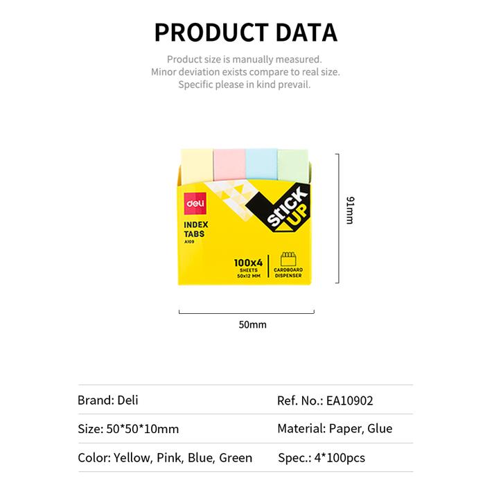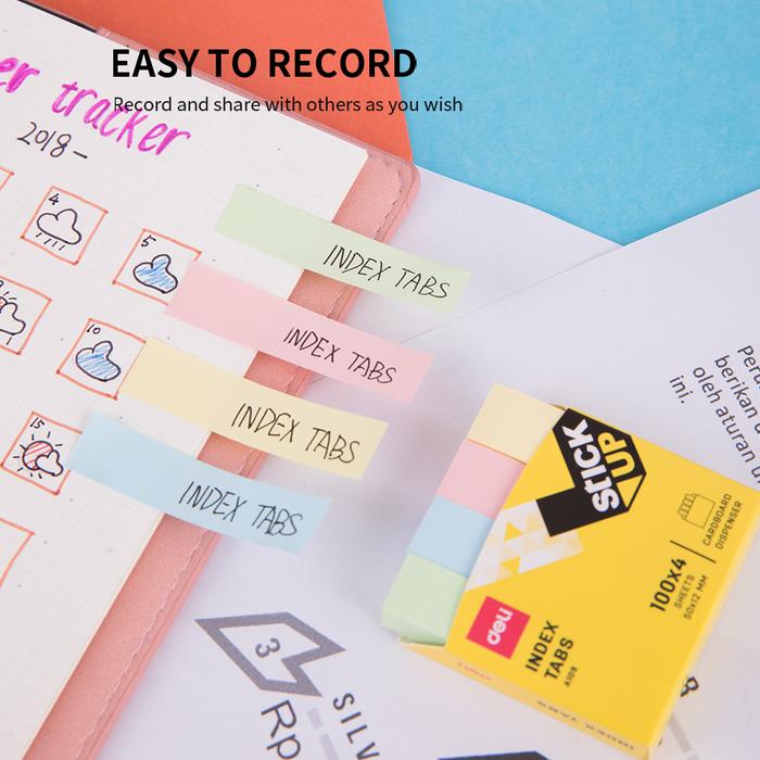 Tingkatkan efisiensi dan kerapian sistem penandaan dokumen Anda dengan Deli Index Tabs Soft Color. Setiap kemasan berisi 400 lembar pembatas yang terbagi dalam 4 warna pastel menawan: kuning, pink, biru, dan hijau. Warna-warna lembut ini memudahkan klasifikasi dan navigasi untuk berbagai keperluan.