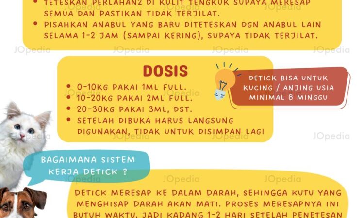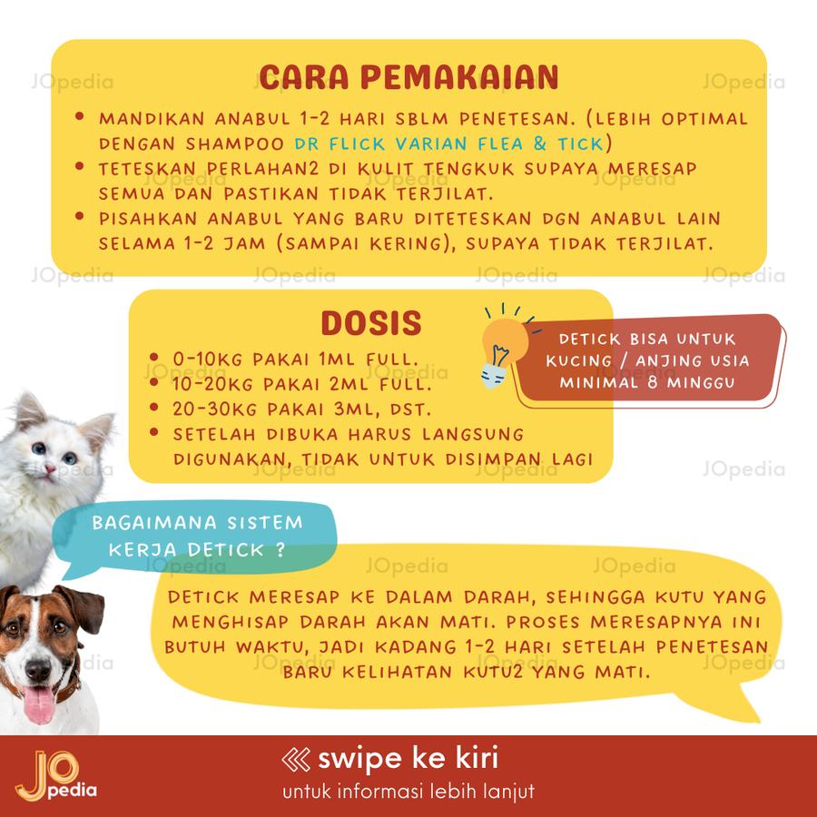 | Detick Plus | ✔ Tambahan formula obat kulit (gatal, scabies) ✔ Proteksi cacing heartworm ✔ Dosis sama dengan Detick Original | 1ml (0-10kg) 2ml (10-20kg) | 30 pcs |