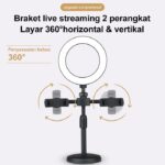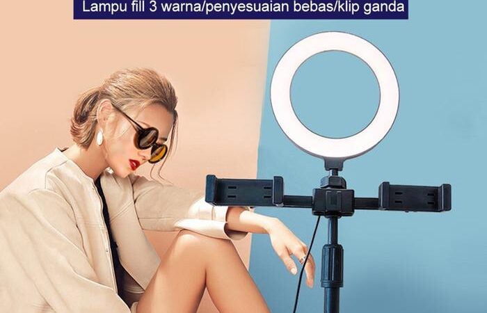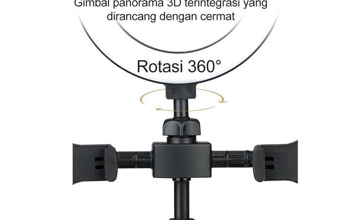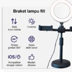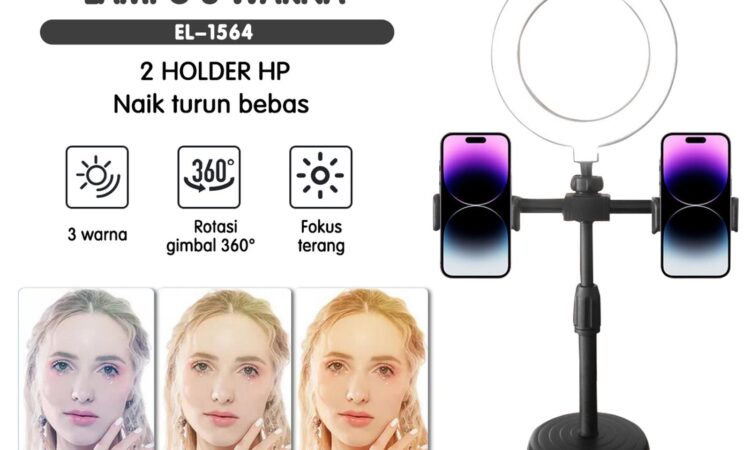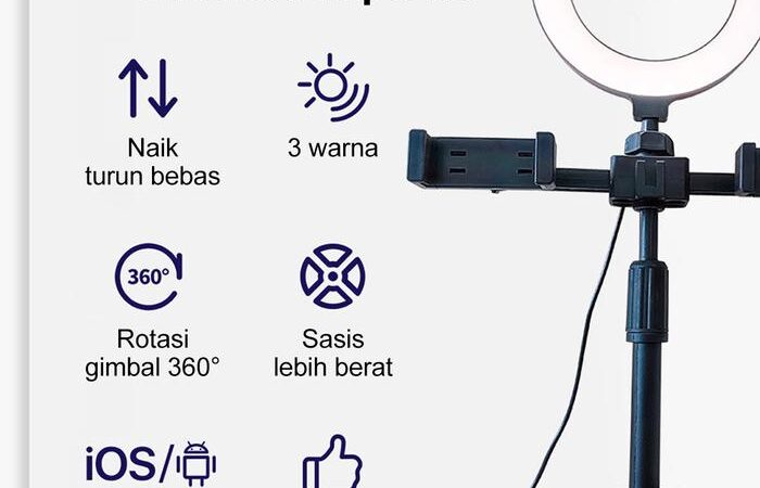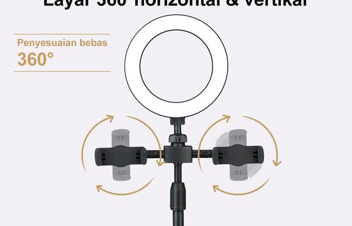 | Dimensi & Paket | Diameter ring: 16cm. Tinggi: 370mm – 460mm (dapat disesuaikan). Paket termasuk: 1x Ring Light, 1x Tripod, 2x Holder HP, 1x Tas Kecil. |