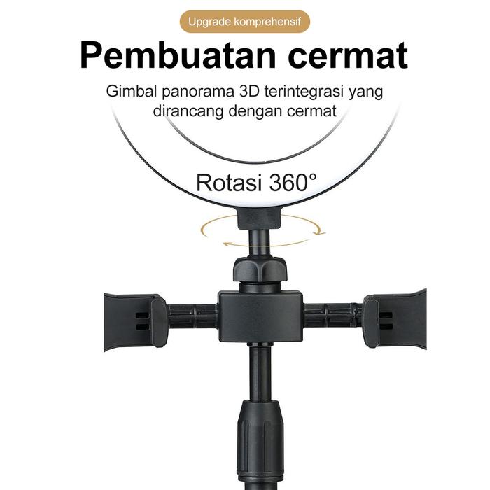 | Dimensi & Paket | Diameter ring: 16cm. Tinggi: 370mm – 460mm (dapat disesuaikan). Paket termasuk: 1x Ring Light, 1x Tripod, 2x Holder HP, 1x Tas Kecil. |
