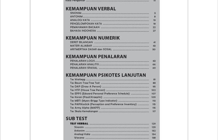 - Tes Verbal: Sinonim, Antonim, Analogi Kata, Pengelompokan Kata, Pemahaman Bacaan, Bahasa Indonesia.