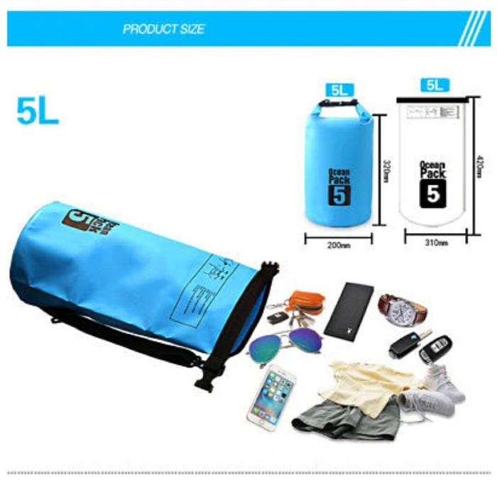 Jangan biarkan cuaca atau medan basah mengganggu barang bawaan Anda! Dry Bag 5L Ocean Pack dirancang khusus dengan material PVC tebal dan berkualitas tinggi, memberikan perlindungan 100% waterproof yang terjamin. Tas ini didesain untuk menahan kondisi terberat, mulai dari hujan badai hingga terendam air, sehingga smartphone, dompet, pakaian kering, dan barang berharga lainnya tetap aman dan kering.
