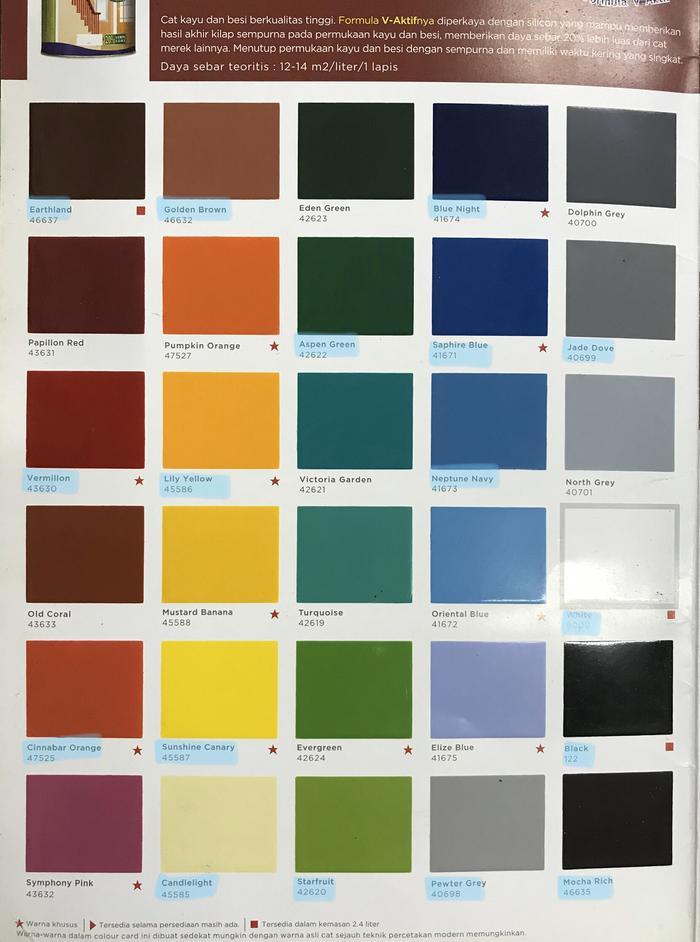 | KHUSUS | Warna dengan kode khusus (custom) dari Dulux. Harga berbeda dengan warna standar. | Dulux V-Gloss Warna Khusus |