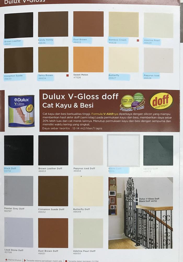 | DOF | Khusus untuk warna Dark Oak Floor (Hitam) dan Pure Oak Floor (Putih). | Dulux V-Gloss Warna DOF |