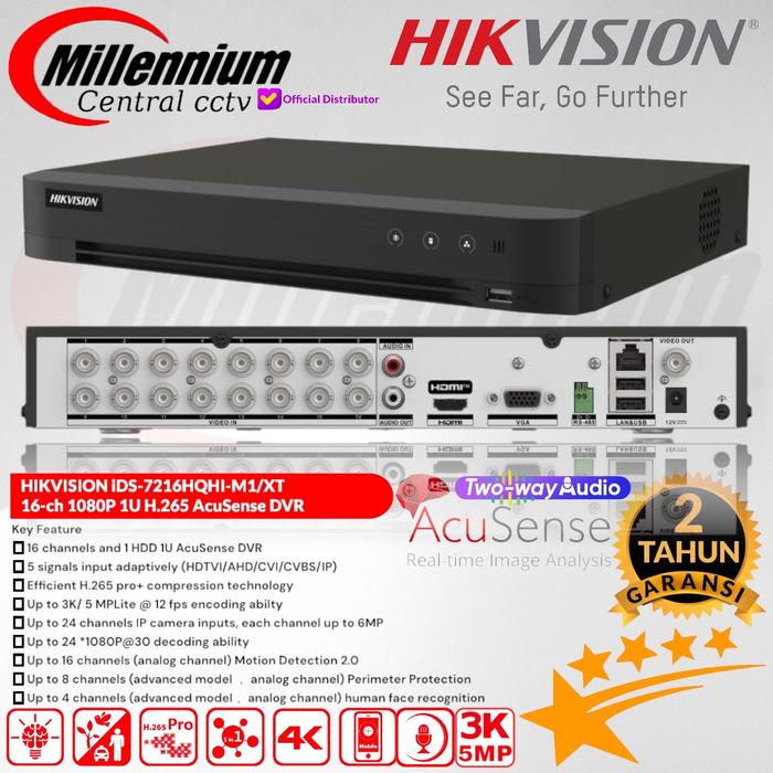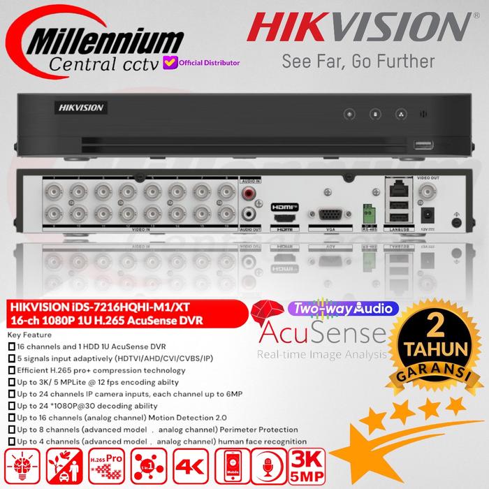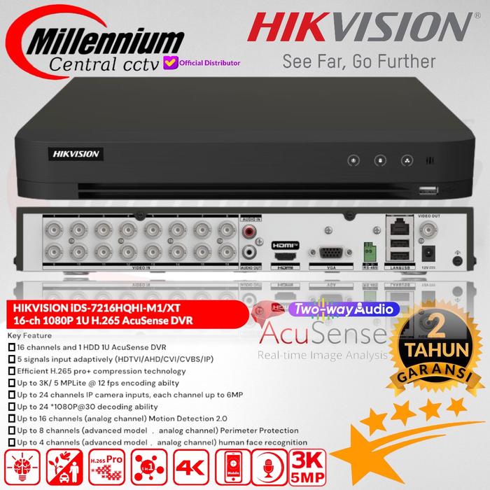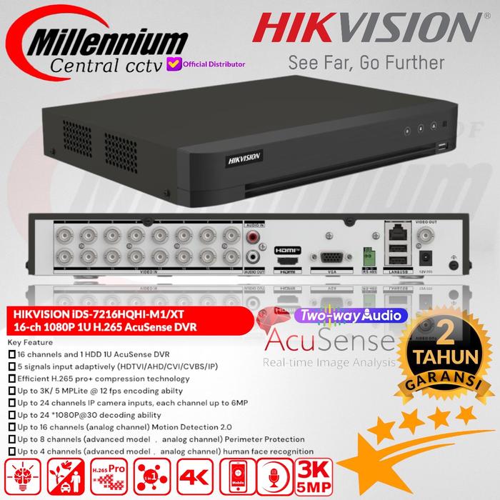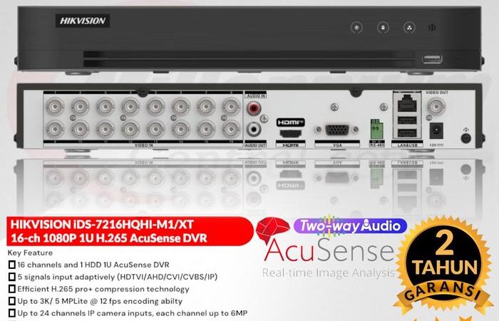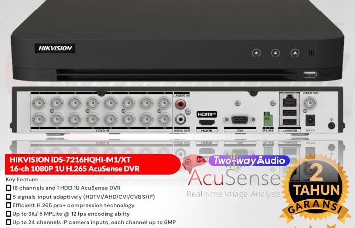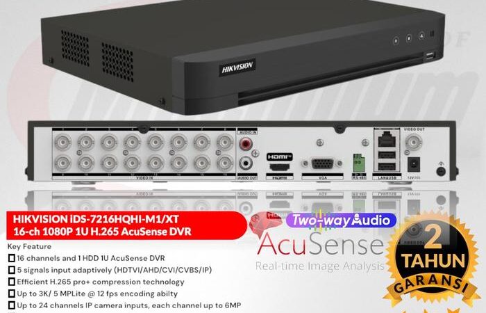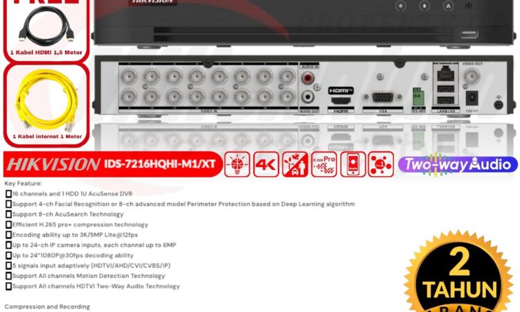 Dengan 16 saluran dan dukungan hingga 24 input kamera IP, perangkat ini sangat fleksibel. Ia kompatibel dengan berbagai tipe kamera (TVI, AHD, CVI, CVBS, IP) Hikvision beresolusi 1MP hingga 5MP. Nikmati fitur Two-Way Audio di semua saluran untuk komunikasi langsung dan pencarian rekaman yang super cepat dengan teknologi AcuSearch.
