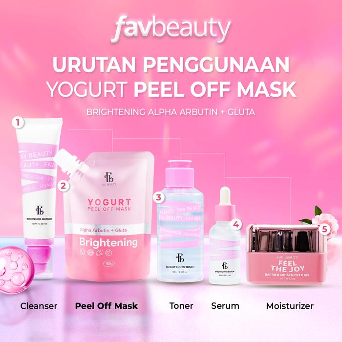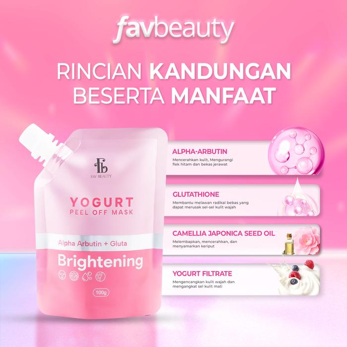 Temukan keindahan alami kulit Anda dengan Fav Beauty Yogurt Peel Off Mask. Diperkaya dengan formula canggih Alpha Arbutin, Glutathione, Camellia Japonica Seed Oil, dan Yogurt Filtrate, masker ini bekerja secara intensif untuk mengangkat sel kulit mati, mencerahkan, serta memberikan nutrisi dan kelembapan maksimal. Teksturnya yang lembut dan mudah diaplikasikan memberikan pengalaman perawatan kulit yang menyegarkan, menjadikan kulit tampak lebih cerah, halus, dan bercahaya hanya dalam satu kali pemakaian.