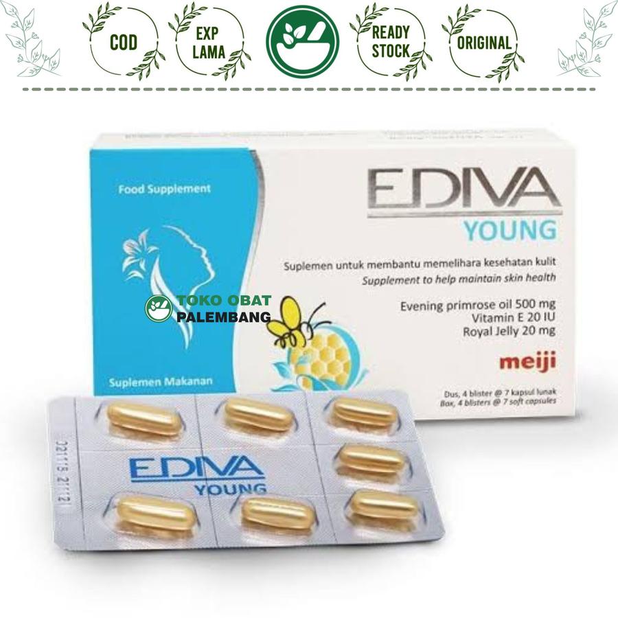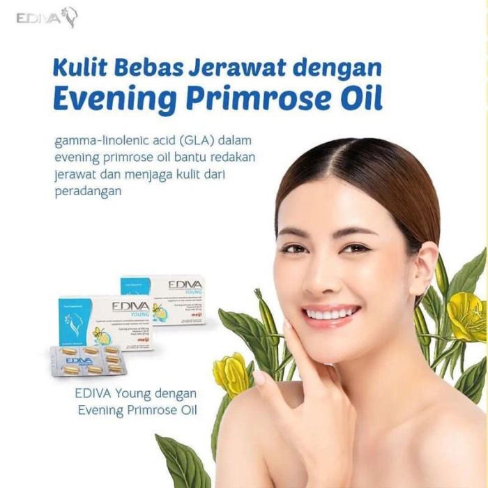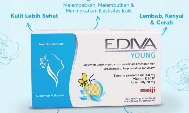 Ediva Young adalah suplemen kesehatan kulit berbahan alami dengan 3 kandungan utama: Evening Primrose Oil (EPO), Vitamin E, dan Royal Jelly. Diformulasikan untuk menutrisi kulit dari dalam, membantu mengatasi jerawat, penuaan dini, serta meningkatkan kelembapan dan elastisitas kulit.