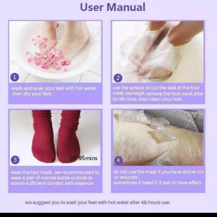 | Isi Kemasan | 1 bungkus berisi 2 masker kaki. |