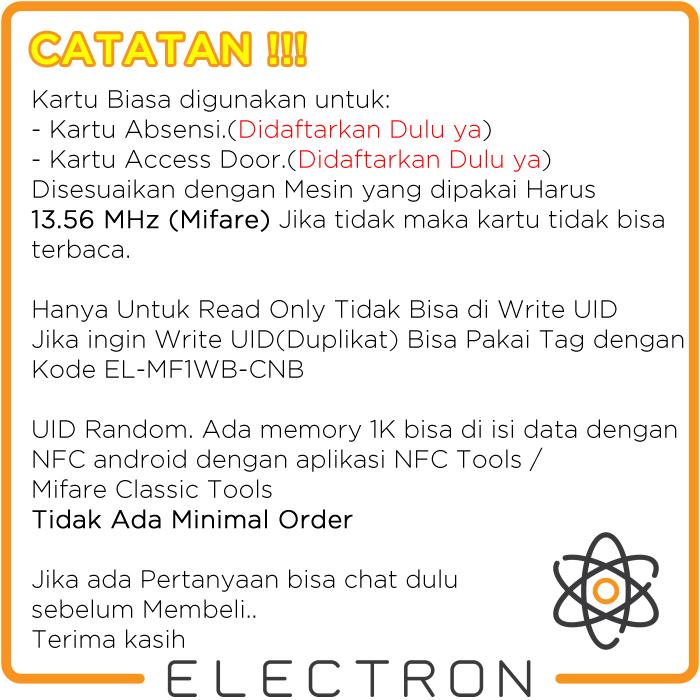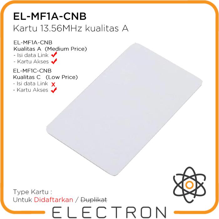 | EL-MF1C | MF1 1K Compatible dengan kualitas standar, cocok untuk read-only (kartu akses terdaftar). Risiko rusak jika di-write data tambahan. |