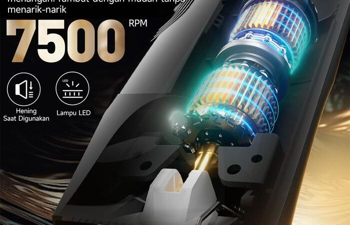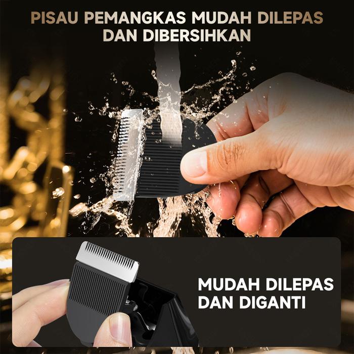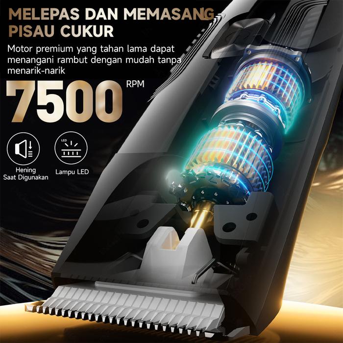 | Motor 7000 RPM | Motor bertenaga tinggi dengan 7000 RPM memotong rambut tebal dengan mudah tanpa menarik atau tersangkut. |