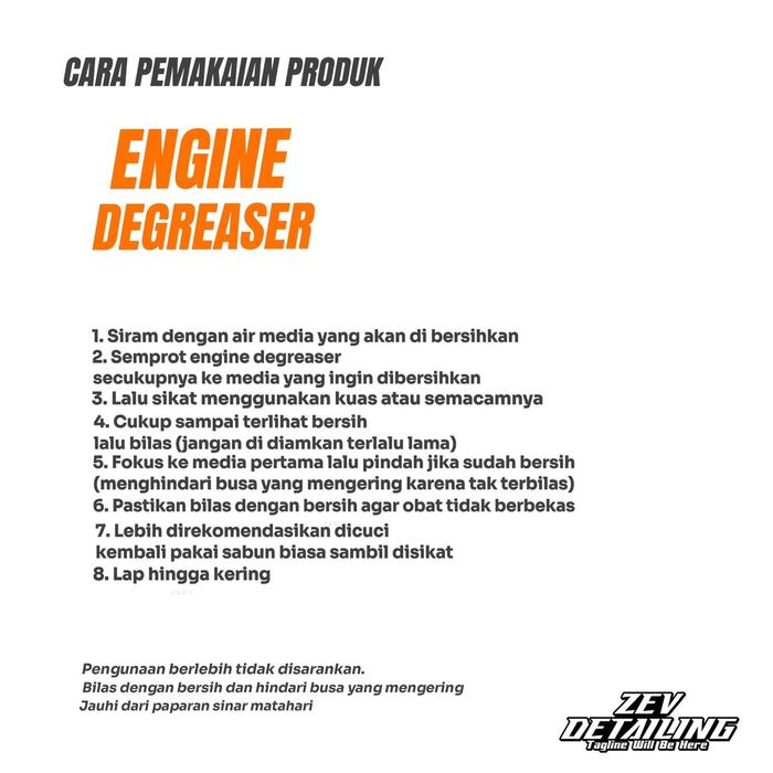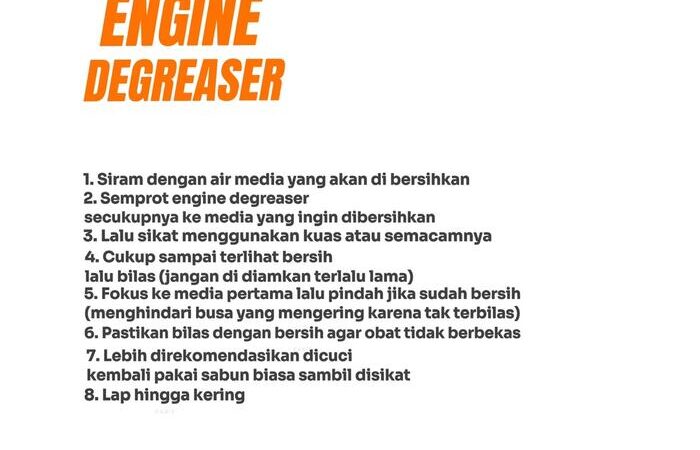 - Engine Degreaser: Cairan pembersih khusus untuk menghilangkan minyak dan kerak pada mesin